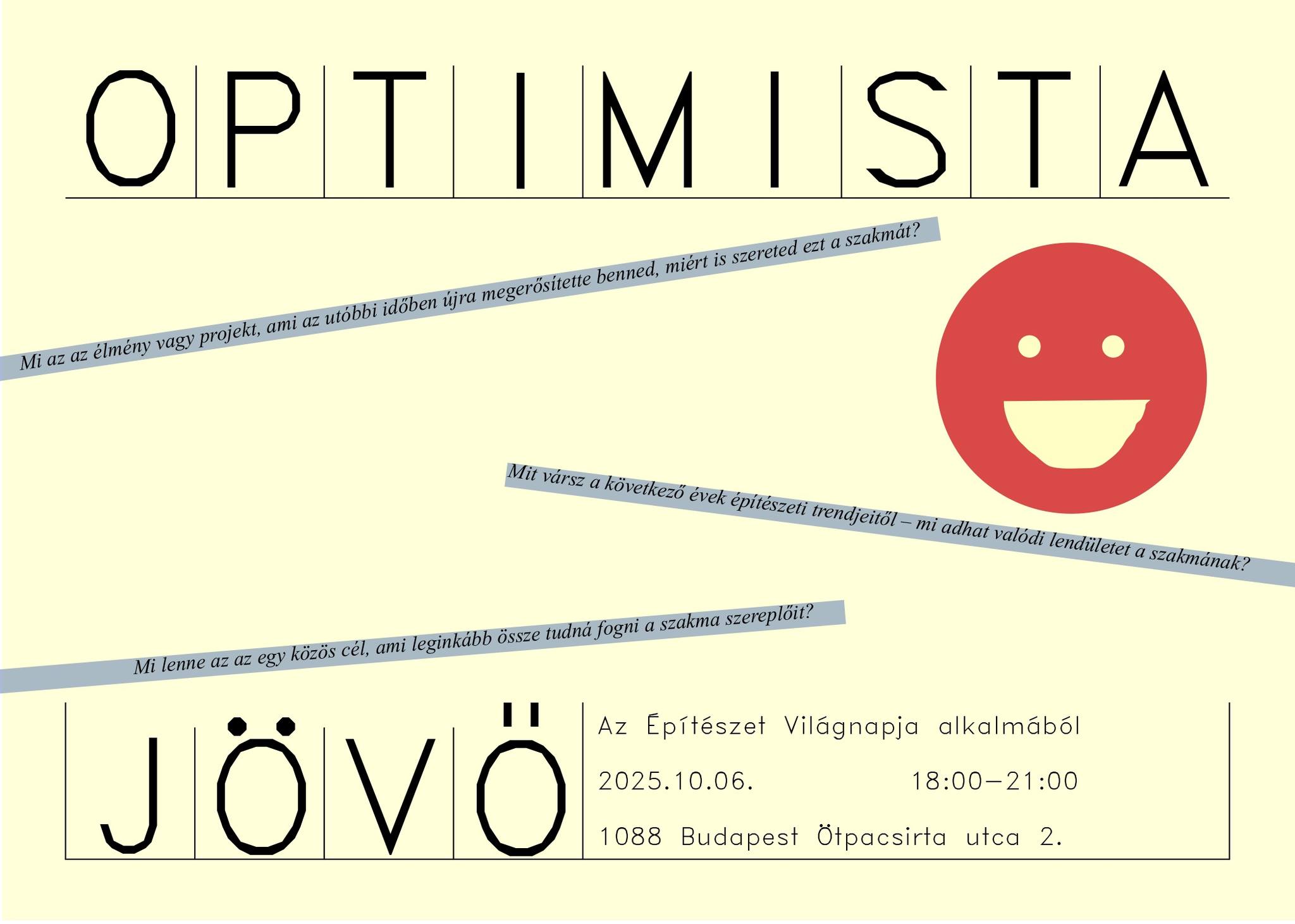 MÉSZ - "Optimista jövő" ünnepi programja MÉSZEsemények2025. október 3.Link másolása vágólapraMegosztásNyomtatás 2025. október 6-án az Építészet Világnapja alkalmából az Építészek Házában.Tisztelt Kollágák! Az Építészek Háza ezen a napon tárt karokkal vár mindenkit, aki szeretné közösen megünnepelni az építészet sokszínűségét és jövőformáló erejét. Optimista jövőt építünk ! Az Építészet Világnapja kiváló lehetőség arra, hogy a szakma képviselői – gyakorló tervezők, hallgatók, társszakmák és intézmények – együtt gondolkodjanak arról, hogyan alakíthatjuk közösen a jövőt. A beszélgetések fókusza nem csupán a kihívásokra, hanem a lehetőségekre, az új szemléletekre és az együttműködésekre irányul. Részvétel ingyenes, de regisztrációhoz kötött. Program: • 18:00–19:00 – „Optimista jövő” – kerekasztal-beszélgetés Moderátor: Probstner Petra Köszöntőt mond: Nagy Csaba (kerekasztal-beszélgetés során szakmai meghívottak osztják meg gondolataikat, a közönség pedig a fogadáson csatlakozhat a kötetlen beszélgetéshez ) • 19:00–21:00 – Fogadás és kötetlen szakmai beszélgetés