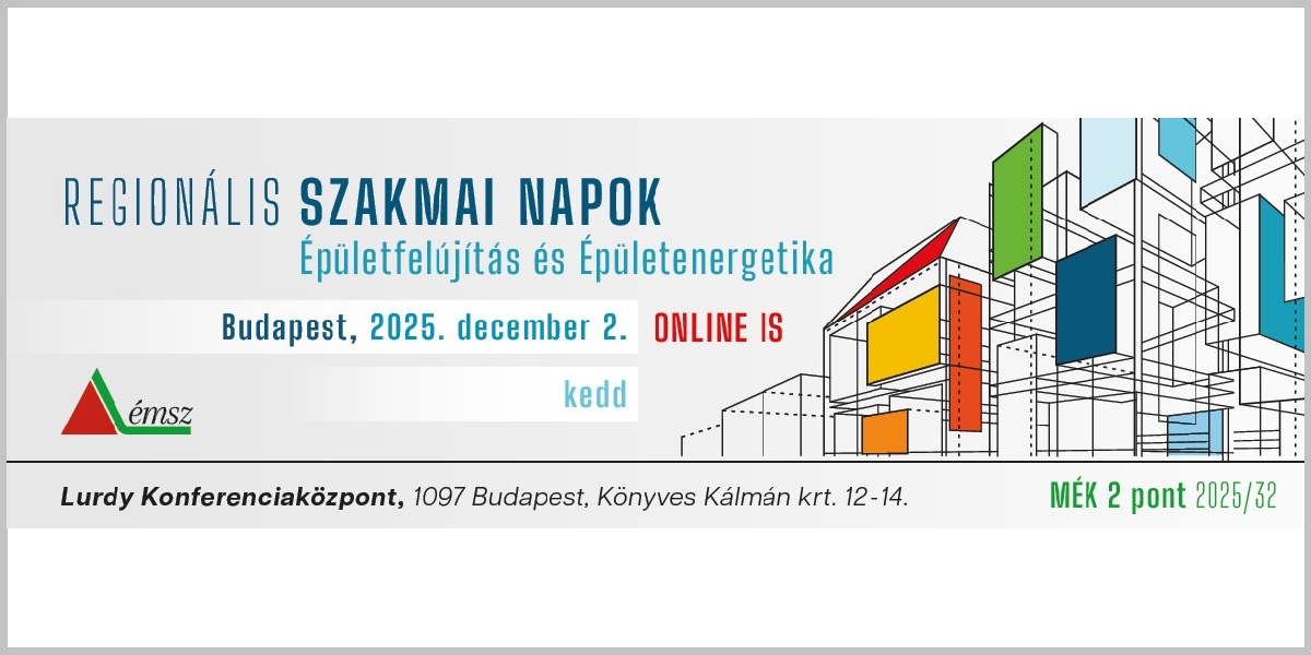 ÉMSZ tematikus reginonális szakmai nap - fókuszban az épületfelújítás és az épületenergetikaÉMSZKonferencia2025. november 17.Link másolása vágólapraMegosztásNyomtatás 2 pontos budapesti konferencia 2025. december 2-án.Kedves Kollégák! A Regionális Szakmai Napok sorozat idei utolsó állomása hagyományosan tematikus konferencia lesz, melynek fókuszában az épületfelújítás és az épületenergetika áll. A képzés személyesen és online is követhető. Az előadók erre az alkalomra új, a témához kapcsolódó prezentációkkal készülnek. Időpont: 2025. december 2. kedd, 9.00 - 17.00 Helyszín: Lurdy Konferenciaközpont, 5. terem, 1097 Budapest, Könyves Kálmán krt. 12-14. A képzés előadásai az aktuális kérdésekre kínálnak megoldást, példák bemutatásával, sok hasznos információval építészeknek és gyakorlati szakembereknek egyaránt. Elismert egyetemi professzorok előadásai és gyártók alkalmazástechnikai ismertetői mellett kivitelezői tapasztalatokat ismerhetnek meg a hallgatók. A helyszínen lehetőséget biztosítanak személyes konzultációra is a gyártók képviselőivel a kiállítási standoknál. Az „Év Tetője 2025 Nívódíj Pályázat” díjazott pályamunkáiról készült kiállítás is megtekinthető az eseményen. Fő témák: - Megbízható tetők, homlokzatok, szigetelések - Környezettudatos építés, innováció, felújítás. - Szakmai szabályok, irányelvek. - Megvalósult projektek, jó példák, tanulságok. MÉK: 2 pont (2025/32) A személyes részvétel - igény esetén a pontigazolás kiállításával együtt - ingyenes, de regisztrációhoz kötött. Az online részvétel - a kötelező regisztráció mellett - továbbképzési pontigénylés nélkül ingyenes, - továbbképzési pontigazolással bruttó 3.000 Ft, az ÉMSZ rendes és pártoló tagjai és kollégái számára azonban az igazolás kiállítása is térítésmentes. Amennyiben Ön személyesen szeretne részt venni: - Előzetesen regisztráljon a lenti linkre kattintva, válassza ki az RSZN Tematikus személyes - Bp., 2025.12.02. részvételt. - Kötelező a reggeli helyszíni regisztráció. - A továbbképzési igazolásokat a rendezvény végén, kizárólag személyesen lehet átvenni. Amennyiben Ön online szeretné megnézni a képzést, pontigazolás nélkül: Regisztráljon a lenti linken keresztül, válassza ki az RSZN Tematikus online pontigazolás nélkül - Bp., 2025.12.02. lehetőséget. A konferencia előtti nap 14 órakor megküldjük Önnek az online közvetítéshez a linket, ahol másnap reggel 9.00 órától követheti élőben a konferencia előadásait. Amennyiben Ön online szeretné elvégezni a képzést továbbképzési pontigazolással: A továbbképzés teljesítéséhez szükséges az előzetes regisztráció, a tesztkérdések megválaszolása és a válaszok visszaküldése a megjelölt határidőig, valamint az igazolások kiállításának díjának - bruttó 3.000 Ft - befizetése. REGISZTRÁCIÓ A részletes program hamarosan elérhető lesz. További információ: Horváth Krisztina ügyvezető kepzes@emsz.hu www.emsz.hu