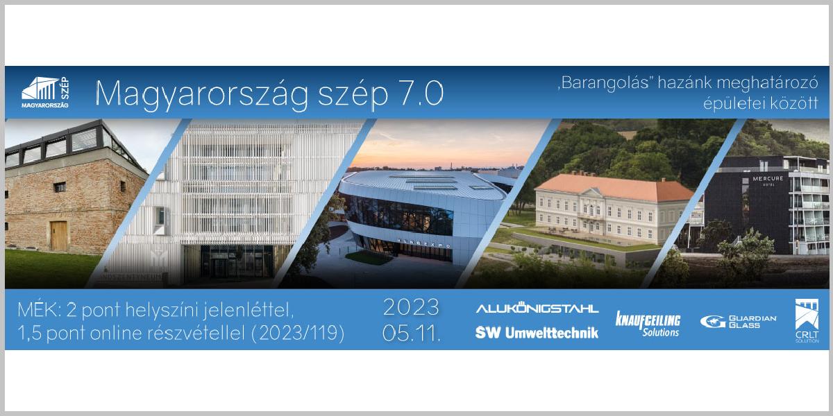 Magyarország szép 7.0 – Barangolás hazánk meghatározó épületei közöttKépzés / Továbbképzés2023. április 25. Konferencia személyes és online részvétellel.A 2021-ben útjára indított Magyarország szép címet viselő hibrid lebonyolítású konferenciasorozatunk a 2023. február 16-i rendhagyó, Év háza családi házak tematika után, ismét a környezetüket meghatározó, nemrég elkészült középületek szemlézésével folytatódik. A továbbképzés fő fókusza olyan itthoni közintézmények, kulturális intézmények, szállodák, kastélyok, amelyek az építészeti kultúránkra is nagy hatást gyakorolnak. Az újabb egész napos „kirándulással” megismerhetünk az elmúlt évekből számos meghatározó nagyberuházást, és folyamatban lévő projekteket is górcső alá veszünk. Ezúttal a zalaegerszegi Mindszentyneum, a Szolnoki Szentháromság templom és volt Ferences rendház, a debreceni Mercure Tokaj Center, az Alsóbogáti kastély és környezete, a megújult Bodajki Vadászkastély, a veszprémi Actycity, a nyíradonyi gyümölcsfeldolgozó és a Hungexpo F1 Fogadóépülete felé vesszük az irányt. Neves építész előadóink segítségével nyerhetünk bepillantást e meghatározó épületek tervezési és megvalósulási folyamatába. A témához kapcsolódó alkalmazástechnikai előadások rendhagyó módon szintén kifejezetten nagyberuházásokat, konkrét megvalósult példákat bemutatva bővítik a résztvevők szakmai tudását. Akkreditáció: MÉK 2 pont helyszíni jelenléttel, 1,5 pont online részvétellel (2023/119) Időpont: 2023. május 11. A több mint 7 órás online továbbképzés május 11-én követhető élőben, és budapesti helyszínen személyesen is részt lehet venni. A közvetítés helyszíne, ahová a kollégákat várjuk: FUGA Budapesti Építészeti Központ (1052 Budapest, Petőfi Sándor utca 5.) Program és regisztráció