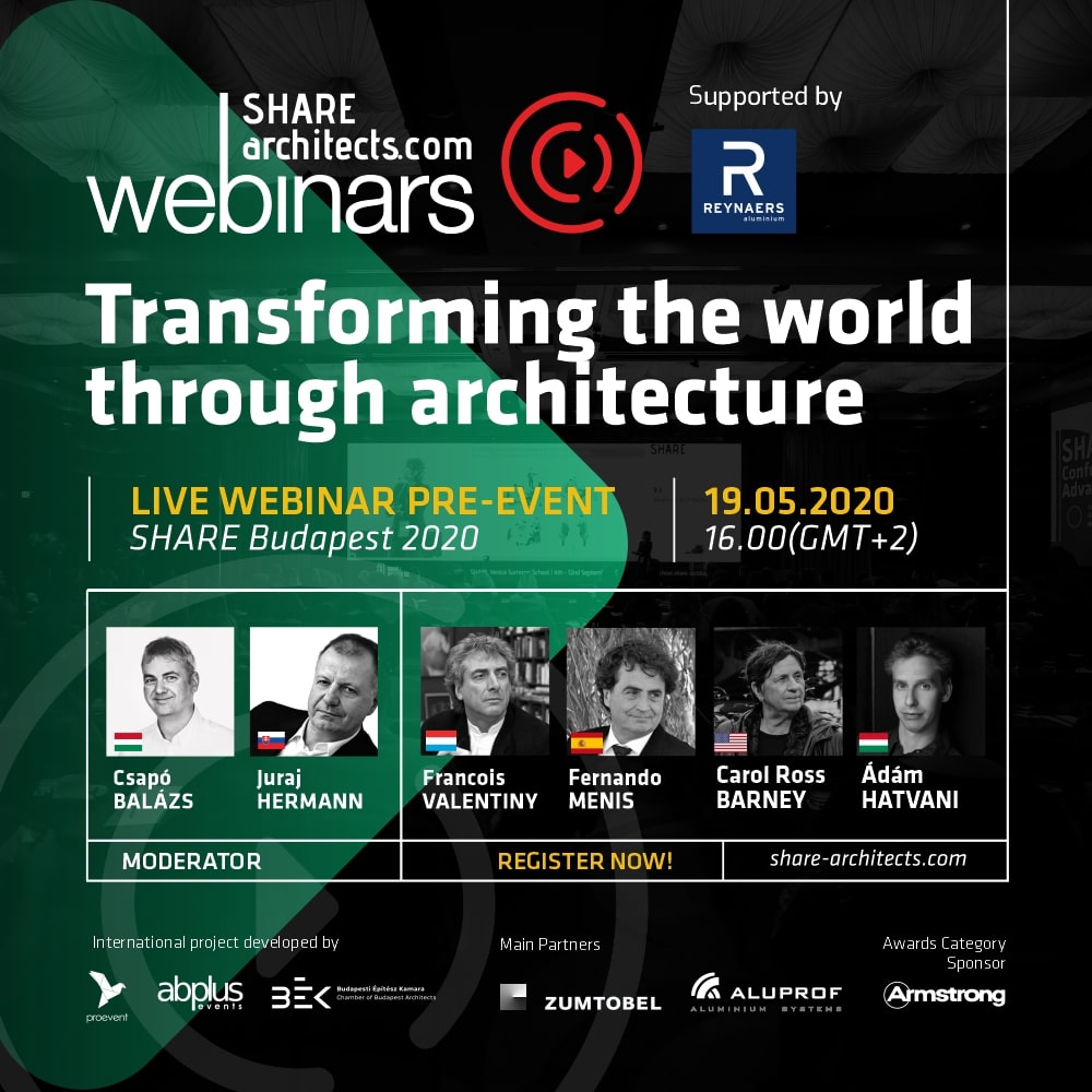 Szakmai továbbképzés - webináriumTitkárságKonferencia2020. május 4.Link másolása vágólapraMegosztásNyomtatásSHARE konferencia az interneten Azonos témával, új előadókkal jelentkezik a SHARE: Transforming the World Through Architecture - A világ átalakítása az építészeten keresztül Időpont: 2020. május 19. 16.00 - 18.00 Moderátor Csapó Balázs építész, BÉK elnök Juraj Hermann építész, Szlovák Építész Szövetség, elnök Előadó Francois Valentiny építész, Luxemburg Carol Ross Barney építész, USA Fernando Menis építész, Spanyolország Hatvani Ádám építész, Magyarország Téma - Architecture in the post-pandemic era - Építészet a világjárvány után - How should architects play their historical role today? - Az építészek történelmi szerepe napjainkban - What should be the vision of the future of the city and architecture? - A város és az építészet jövőképe - Health care facilities for the future of humankind - Egészségügyi ellátó létesítmények az emberiség jövőjéhez - Safe collective dwelling - Biztonságos lakhatás - Education and work after the health crisis - Oktatás és munka az egészségügyi válság után - Pandemic is also an Urban Problem - A pandémia, mint városi probléma - Social distancing, closeness through technology - Szociális távolságtartás és a technológia - Narratives Beyond Crises - A válságon túl Az előadások angol nyelvűek. A webináriumon való részvételhez előzetes regisztráció, az előadások ideje alatt állandó internet kapcsolat szükséges. A képzés a www.zoom.us felületen zajlik. Regisztráció: https://www.tickettailor.com/events/share2019/369141/ Részvételi díj: 15 EUR vagy SHARE Community tagoknak ingyenes (A Share Community tagság a jelentkezéssel egyidőben igényelhető, ingyenes) MÉK továbbképzési akkreditáció: 1 pont (2020/107)